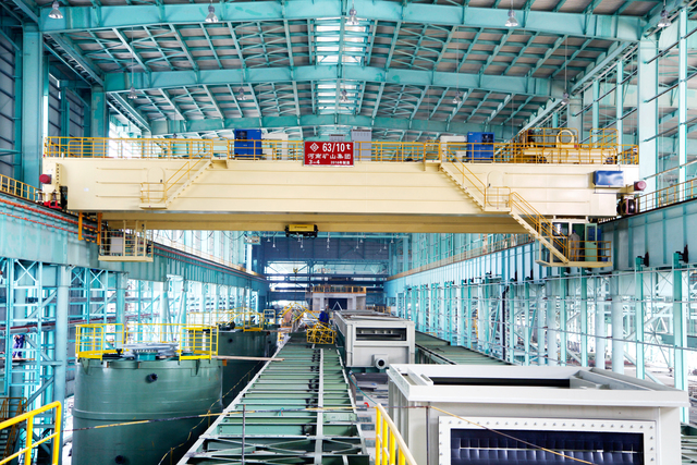 該產品采用雙梁雙軌梁結構,是目前國內較大的雙梁單小車鑄造起重機,橋架由兩根主梁和兩根鉸接端梁組成。整體布置緊湊合理。 減速器全部采用硬齒面減速器;滑輪采用新工藝軋制滑輪,外形美觀,繩槽耐磨;主要受力軸類全部采用鍛件;為保證裝配精度,采用整體加工制造工藝。 整車采用模塊化,等強度等壽命設計理念,同時考慮人機工程更科學,傳動件與結構件匹配更合理,不僅方便檢修維護,同時可大大提高了整機的壽命周期。